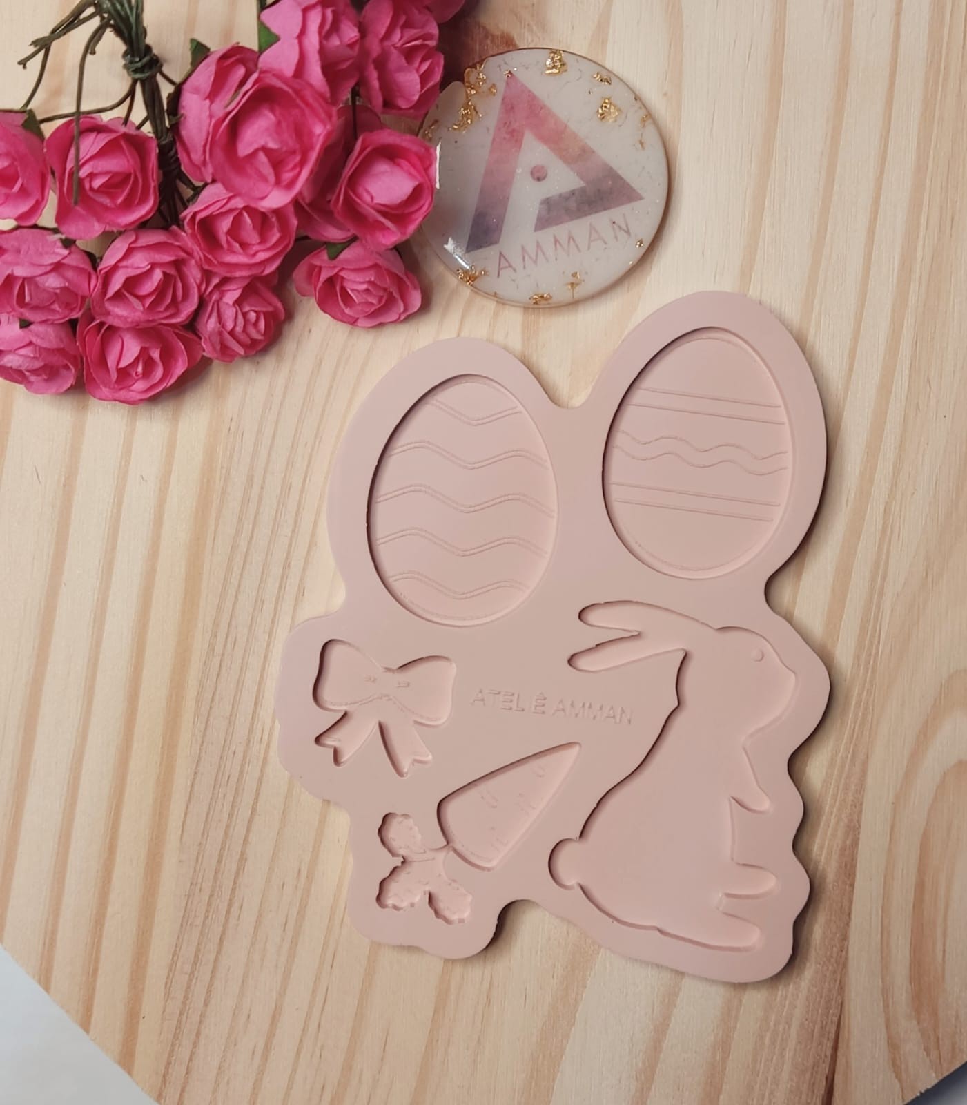Tamanho: 5 Cavidades: 2 Ovos 3,8cm x 3,0cm / 1 Cenoura 2,9cm x 3,0cm(cabinho) 1,2cm (cenoura) / 1 Coelho 4,7cm x 3,5 / 1 Laço 2,1cm x 1,9cm